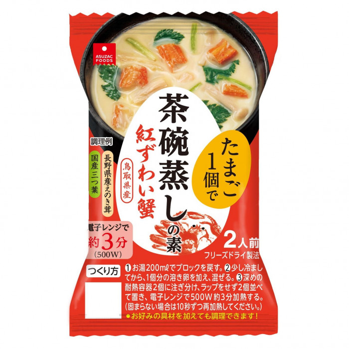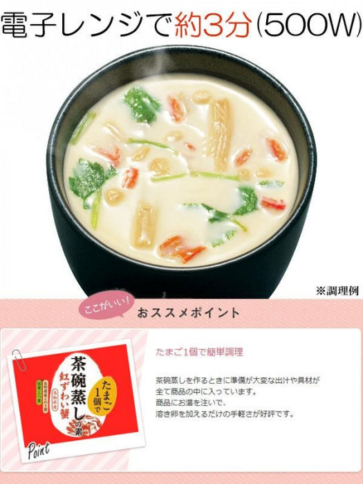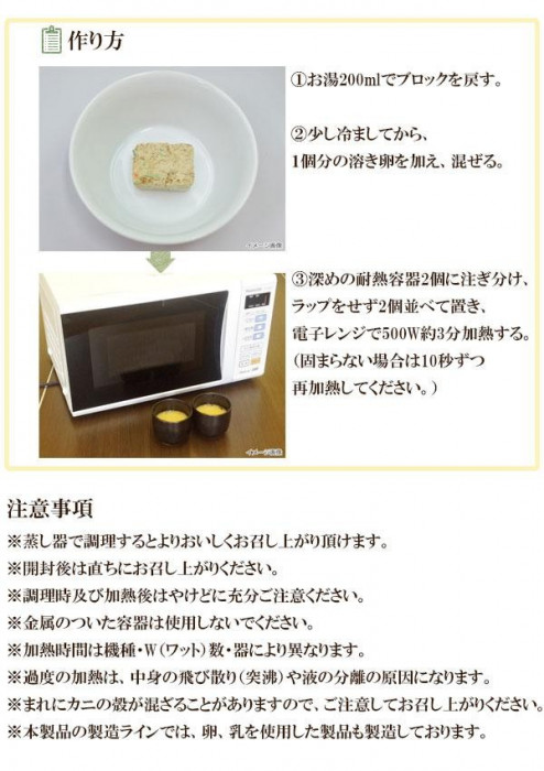 | 原材料 | 名称:茶碗蒸しの素 えのき茸、紅ズワイガニ、魚介エキス、みつば、澱粉、食塩、発酵調味料、かつおだし、椎茸エキス、酵母エキス、酸化防止剤(V.E)、(原材料の一部に小麦、えび、大豆を含む) |
