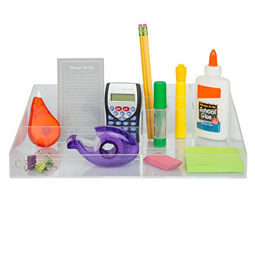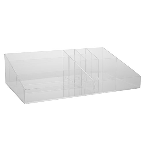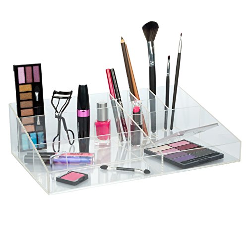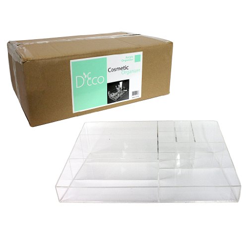 Acrylic Jewelry & Cosmetic Storage Display. Large Makeup Organizer with 9 Compartment , (12.5" X 8.5") by D'Eco. This deluxe cosmetic/ makeup organizer has 9 compartments to easily organize and store all your beauty aids, craft supplies, cosmetics, makeup, office supplies, and more. Features a variety of different sized compartments to hold lipsticks, lotions, cosmetics, brushes, tools, clips, post it notes, pens, markers, paint, and more. Crystal clear acrylic is stylish and blends in with any decor. Cleans easily with soap and water.