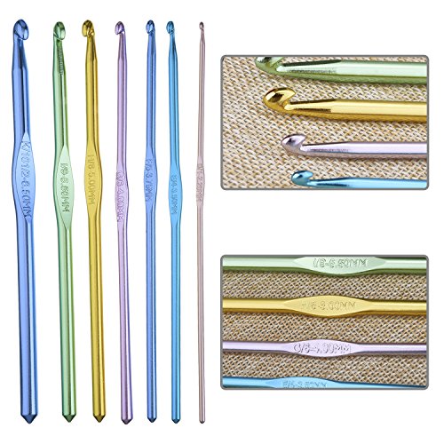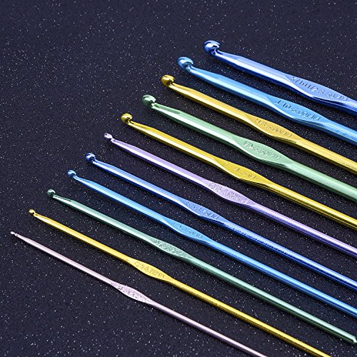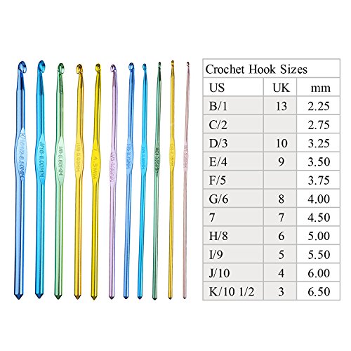 - 11 Pieces aluminum crochet hooks: the hook are color coated with US standard sizes, B/ 1-2.25 mm, C/ 2-2.75 mm, D/ 3-3.25 mm, E/ 4-3.50 mm, F/ 5-3.75 mm, G/ 6-4.0 mm, 7-4.5 mm, H/ 8-5.00 mm, I/ 9-5.50 mm, J/ 10-6.0 mm, K/ 101/ 2-6.50 mm