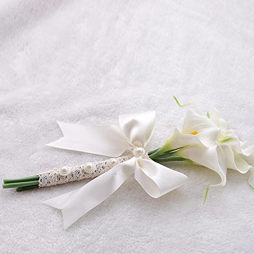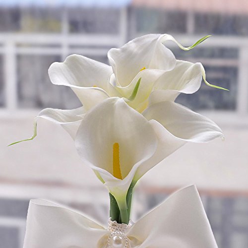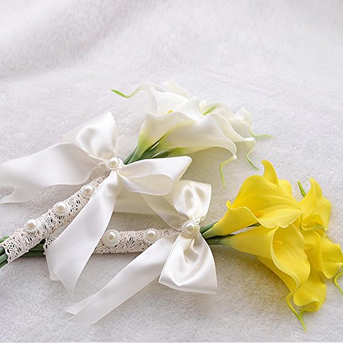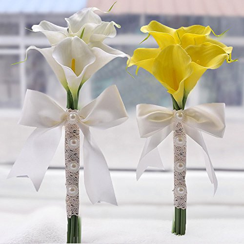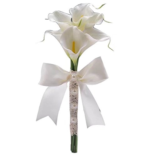 Moleya 6 Inch Vintage PE Artificial Calla Lily Handmade Wedding Flower Bouquets Bridal Bridesmaid Holding Throw Bouquets with Ribbon, White