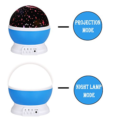 -. Feature : ►NEW TYPE:There are 4 pcs LED Beads of warm light, blue light, green light, red light which can create eight color options.Customize your sky the way you like! / ►THREE MODES: A--Button allows for a normal light.B--Changes the colors from single color to multiple color layered on top on each other.C--360 Degree Rotation. / ►More energy-efficient:Powered by USB cable(2.63 FT) with cell phone charger/computer or 3 AA batteries (Charger and batteries are NOT included) / ►PROMOTE SLEEP:Get closer to the moon and stars, quiet and smart, and give your child a good night's rest with this night light for kid's room. What is more, it can help parents coax the baby to sweet sleep. / ►100% GUARANTEED:We take P.R.Ide in delivering top quality products!We know you'll love them, but if you don't, We guarantee a FULL refund.TOTALLY RISK FREE!