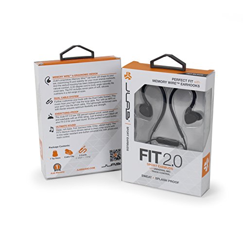 FIT 2.0, Sport Earbuds CUSTOMIZABLE FITSWEAT + SPLASH PROOF The ultimate workout partner, JLab Fit 2.0 sport earbuds will keep you rocking through it all: running, biking, climbing, whatever. Get your custom fit with the Memory Wire ear hook and Dual Cable System. Plus the Fit 2.0's sweat- and splash-proof design will keep you rocking through rain and sweat. Work it out! Memory Wire. Bend it like Beckham. JLab's proprietary Memory Wire ear hook will shape to your ear, maximizing fit and stability for your most intense workouts. Dual Cable System. Go long. Or stay short. Further customize your buds with the Dual Cable System. Play music from your hip? Use the long cable. Run with an MP3 on your arm? Use the short cable. The lightweight reinforced cable with Kevlar ensures optimum flexibility and strength. Everything-proof. Blood. Sweat. Tears. And whatever else you can dish out. The JLab FIT 2.0 are 100 percent splash-proof, sweat-proof and washable with an IPX4 rating. Just finished a run? Wash off your Fit 2.0 for your next round. It's the perfect workout buddy. Ultimate Sound. Rock it out. Deep, rich bass. Full, luscious mids Crisp, vibrant highs. The FIT's titanium micro-drivers deliver a clean, crisp sound with in-line water resistant one-button universal mic with phone and track control. Ergonomic Design. Designed, tested and fitness approved. The earbud housing has been redesigned to maximize natural comfort. A 45-degree cord to body angle naturally fits most ears. The FIT includes seven pairs of soft, silicone cushions in a full range of sizes.