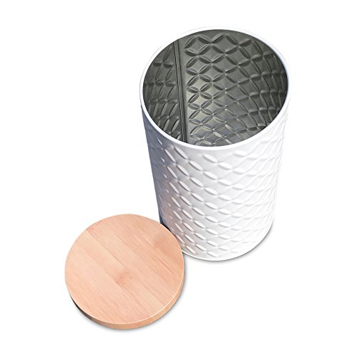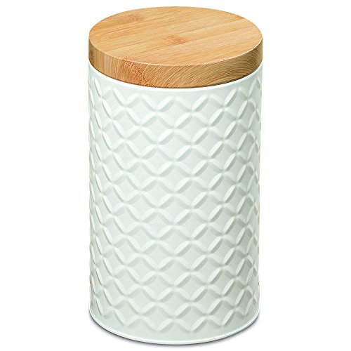 Studio : Whole House Worlds Publisher : Whole House Worlds Product Description KEEP IT FRESH air tight, the Naturally Modern Cookie Canister is designed to keep your baked and dry goods stored away from humidity longer. Embellished with a raised diamond shaped ikat pattern this chic cylinder is topped with a tight fitting lid. SHATTER PROOF Practical, sturdy, and light weight, this shatter proof canister is designed to fool the eye and look like it is made of ceramic and wood. It is cleverly crafted of white iron and topped with a realistic faux wood top (also metal.) The handled top opens to reveal a smooth white shiny interior. Well sized, this piece measures as follows: 4 ¼ L x 4 ¼ W x 7 ½ H inches. VERSATILE Full of practical modern farmhouse chic, this stylish storage canister is ideal for storing and organizing a variety of household items in your spaces. AN IDEAL GIFT, it's perfect to celebrate holidays, birthdays, weddings and many more. So gorgeous, you'll want to keep it at home for yourself. Enjoy! By Whole House Worlds Welcome to the product line of Whole House Worlds. The New York based company offers high quality, stylish products for every room in the house, and beyond. From the kitchen, to the living room, to the bedroom, dining room, home office, closet and garden: Our criteria are comfort, quality, style and value. 0