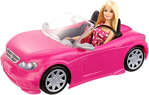 -. Feature : Hit the road in style with this super glam Barbie convertible car / Barbie doll is ready for anything dressed in a pink dress with graphic white P.R.Int, strappy pink shoes and sunglasses perfect for a sunny drive / Her two-seater vehicle is designed in a sparkly pink with silvery accents / Realistic tires are ready to roll into adventure / Black interior seats feature seat belts for safety and Barbie "upholstery" labels for style