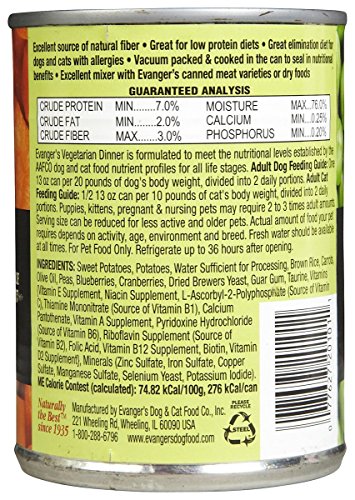 Premium quality Evanger's Super Premium Gold Vegetarian Dinner is prepared with fresh potatoes, carrots, peas, cranberries and blueberries. This recipe is enriched with brown rice to add wholesome goodness to your pet's dinner. This canned vegetarian formula can also be a wise choice for pets with food allergies and sensitivities.