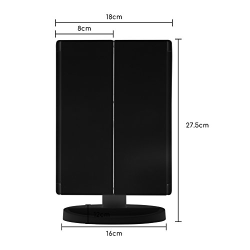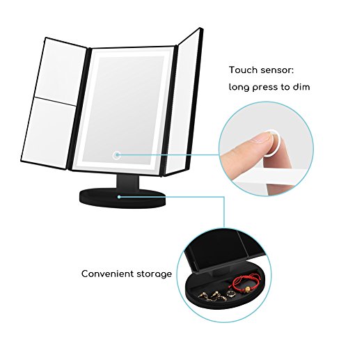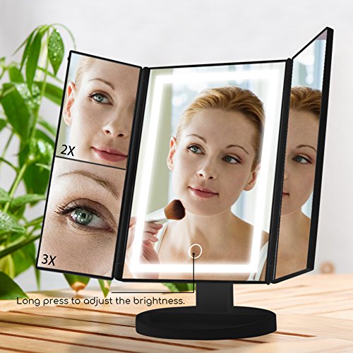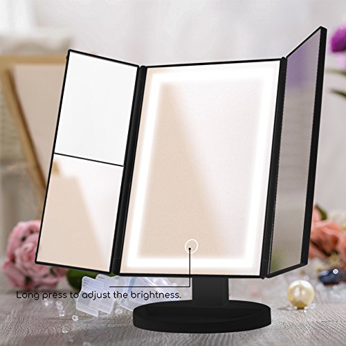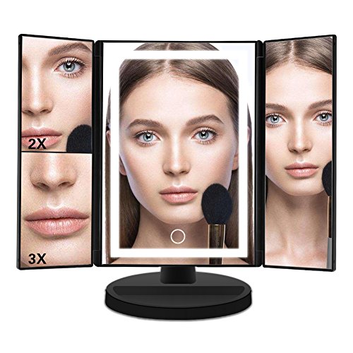 Mondeer Trifold Led Lighted Mirror Makeup Vanity Mirror,Touch Screen 22 LED Lights,180 Free Rotation,Dual Power Supply,3X/2X Magnification Mirror,Table Countertop Cosmetic Bathroom Mirror(White/Black)