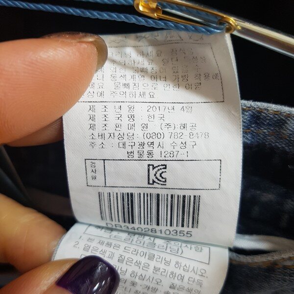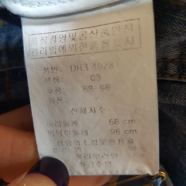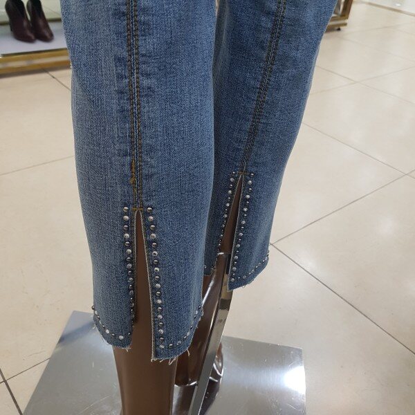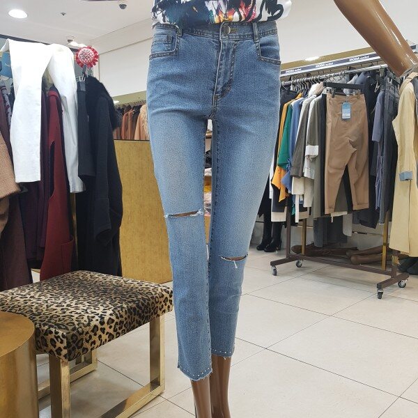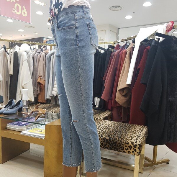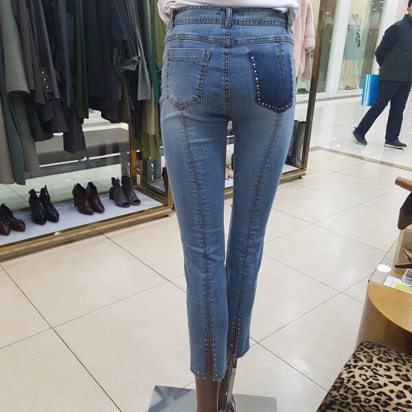 엉덩이포켓과 뒷단 트임에 큐빅장식으로 포인트를 준 디자인입니다.