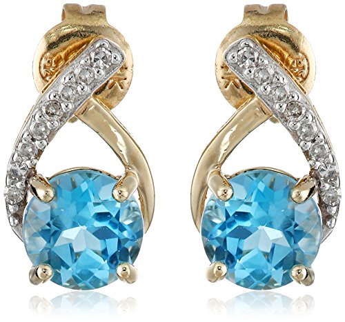 Gold earrings featuring prong-set round Swiss Blue Topaz gemstones bordered in teardrop-shape frames with diamond accents