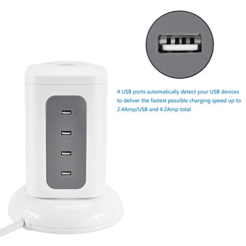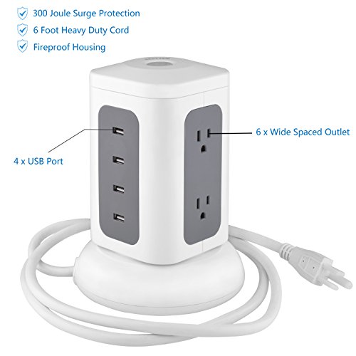 Bestten Multi-Functional Charging Station Tower: 6-Outlet Surge Protector with 4 USB Charging Ports (4.2A Total), Overload Protection, 6 Foot Cord