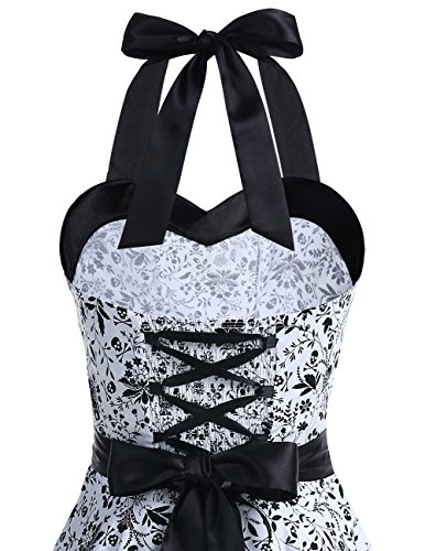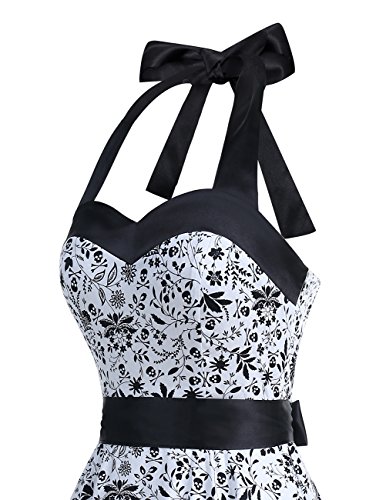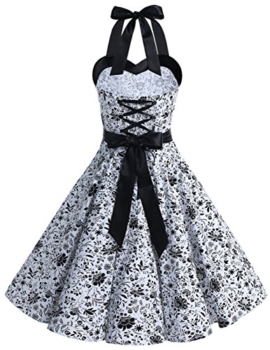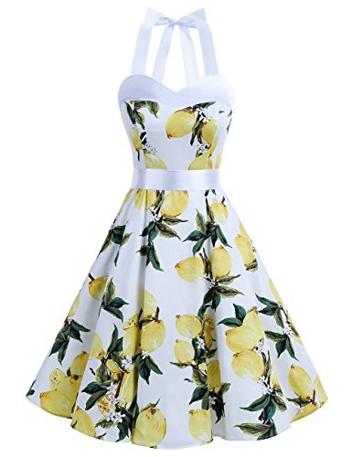 With its elegant halter neckline, form-fitting bodice, empire waist, size zipper up closure, lace up elastic back, and knee length skirt, this elegant knee length retro audery dress is worthy of celebration!