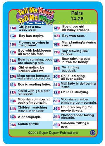 -. Binding : Toy -. Brand : Super Duper® Publications -. EAN : 9781586502379 -. Feature : 52 illustrated cards (2 1/2" x 3 1/2") - 26 card pairs each match an outcome (egg hatching) on Card A with its cause (hen on egg) on Card B / Includes storage tin and content, bonus, and game idea cards / Educational - Helps children improve their reasoning and epressive language skills / Compare & Contrast Fun Deck App available on the Amazon Appstore for Android / You might enjoy our "If...Then... Fun Deck" Cards - also featured on Amazon -. ISBN : 1586502379 -. Label : Super Duper® Publications -. Manufacturer : Super Duper® Publications -. MPN : FD-44 -. PackageQuantity : 1 -. PartNumber : FD-44 -. ProductGroup : Toy -. ProductTypeName : TOYS_AND_GAMES -. Publisher : Super Duper® Publications -. Studio : Super Duper® Publications -. Title : Tell Me How! Tell Me Why! Fun Deck Cards - Super Duper Educational Learning Toy for Kids