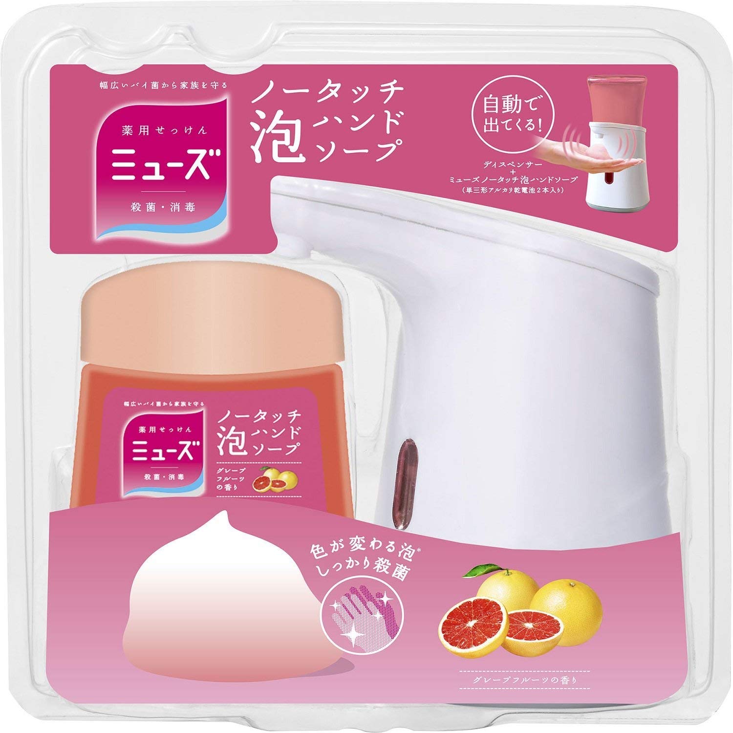 薬用せっけんミューズ ノータッチ 泡ハンドソープ グレープフルーツの香りは幅広いバイ菌・ウイルスを殺菌・消毒・除菌するハンドソープです。トイレや洗面所での普段使いで手をキレイに保ちます。