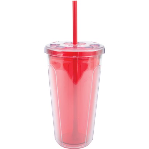 -. Feature : 24-ounce capacity / Double-wall BPA free plastic, won't sweat / Reusable straw stays put and keeps drinks perfectly mixed / Trendy colored outer/inner / Hand washing is recommended for care