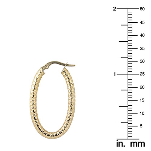 This pair of gold oval hoop earrings is 3mm thick with a height of 1.2 inches