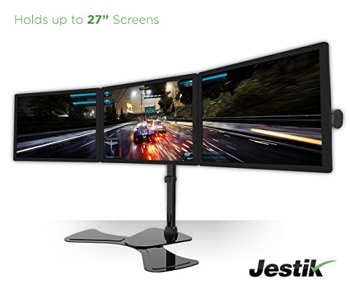 Jestik Arc Triple Monitor Stand introduces an all-in-one solution for a healthier and more productive way to work or play. Designed with full ergonomic capabilities, you can tilt, swivel or rotate, your choice for optimal viewing positions for your monitors. If your monitor's not the right height, its quick release feature and up & down adjustment lets you easily slide your monitors up or down, depending on your preference. The outside wings lets you choose an optimal viewing angle to adjust your monitor outward or inward.
