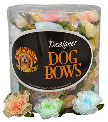 -. Binding : Misc. -. Brand : Amazing Pet Products -. EAN : 0734663599150 -. Feature : *1.25" Lace Flower Bow with rubber band. Assorted colors. / *Tub of 100 pieces of beautifully crafted colorful designer hair bows. / *Easy on/easy off with a rubber band. / *Great designer dog hair bows for groomers and pet owners. / *Add some style and fashion to your dogs' appearance. -. Label : Amazing Pet Products -. Manufacturer : Amazing Pet Products -. MPN : 9899394 -. PackageQuantity : 1 -. PartNumber : 9899394 -. ProductGroup : Pet Products -. ProductTypeName : PET_SUPPLIES -. Publisher : Amazing Pet Products -. Studio : Amazing Pet Products -. Title : Amazing Pet Products Designer Dog Bows Lace Flowers with Rubber Bands. Tub of 100 Bows. Sparkly Pet Grooming Accessory. -. UPC : 734663599150