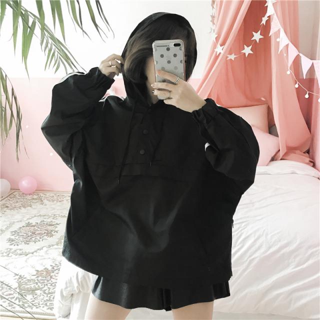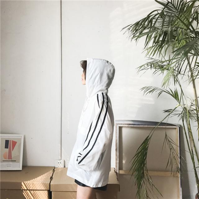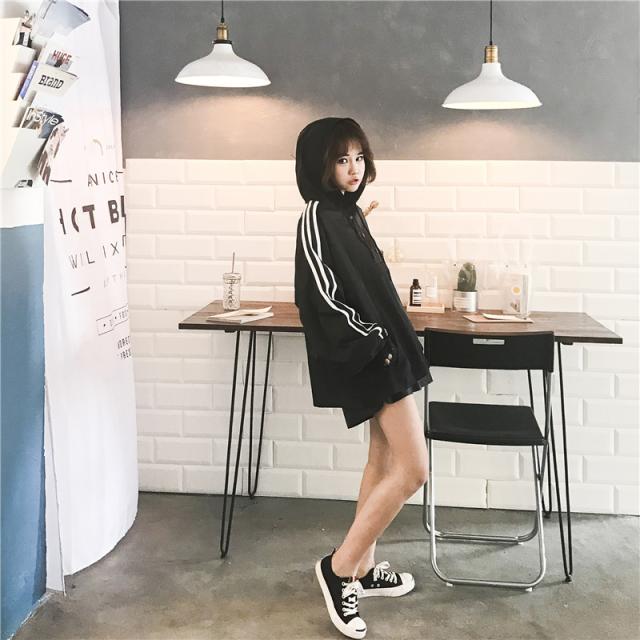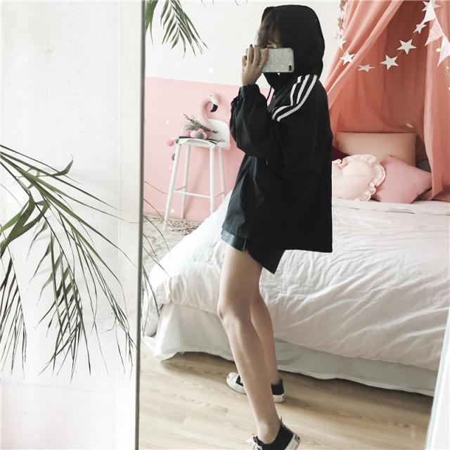 肌寒い日にさっと着れるウインドブレーカー。パーカースタイルが可愛いのとライン入りがアクセントになって