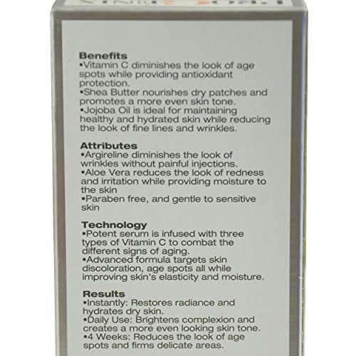Face serum with vitamin C also contains Argireline has similar abilities to Botox without the painful injections. Aloe Vera is able to reduce redness and irritation while providing moisture to the skin. Apply this serum before using a face moisturizer or face cream and as always, it's recommended to use a product with SPF prior to going outside.