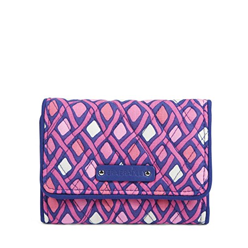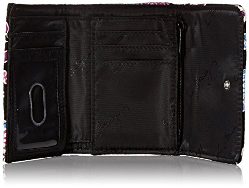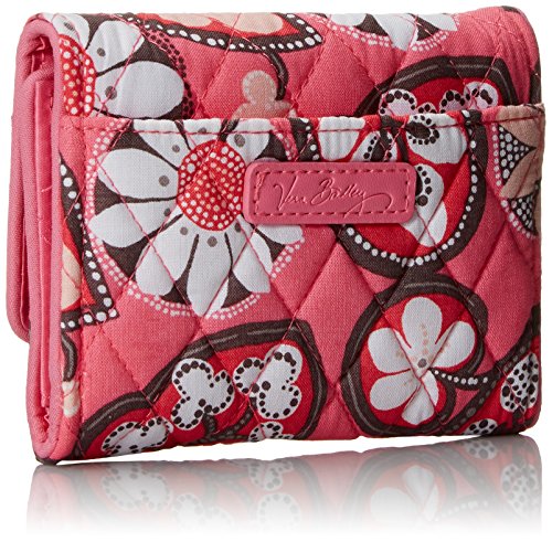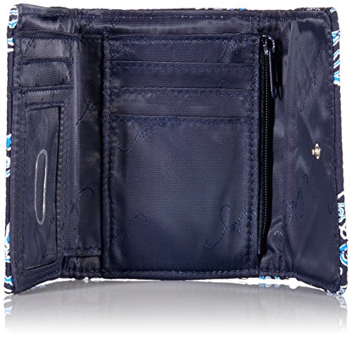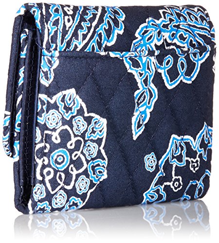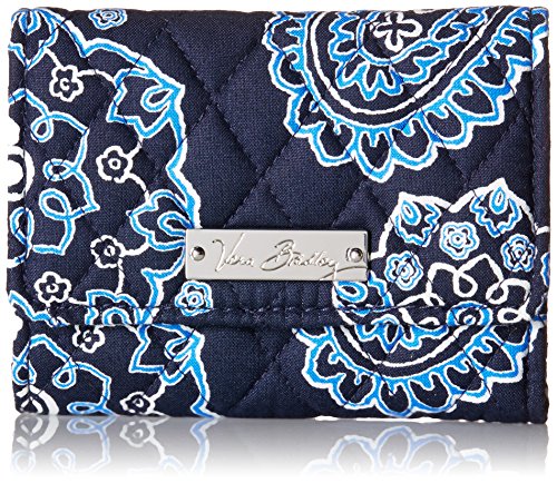 -. Binding : Apparel -. Brand : Vera Bradley -. Color : Silver -. Department : womens -. Feature : Pin-snap closure / Inside, one bill pocket, four credit card slots, a zippered coin pocket and an ID window / Back slip pocket / Silver-toned logo plaque -. Label : Vera Bradley -. Manufacturer : Vera Bradley -. Model : Petite Trifold Wallet -. PackageQuantity : 1 -. ProductGroup : Shoes -. ProductTypeName : ACCESSORY -. Publisher : Vera Bradley -. Size : 5" W x 4" H -. Studio : Vera Bradley -. Title : Vera Bradley Petite Trifold Wallet
