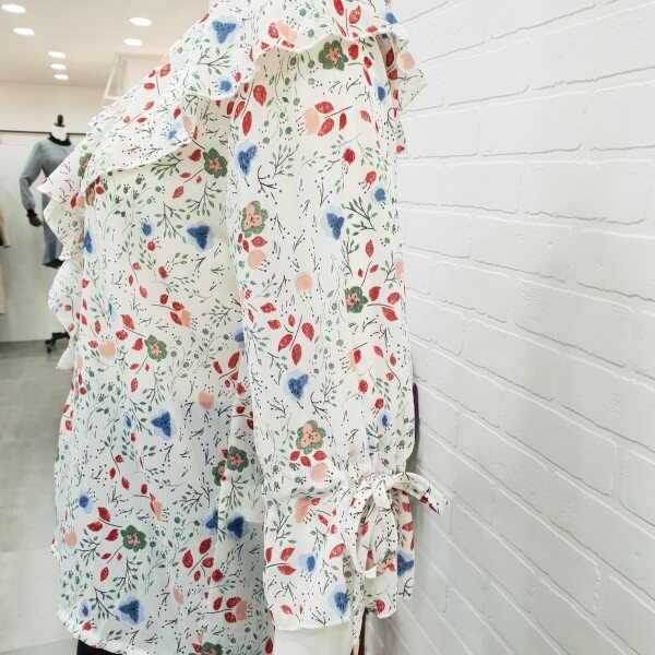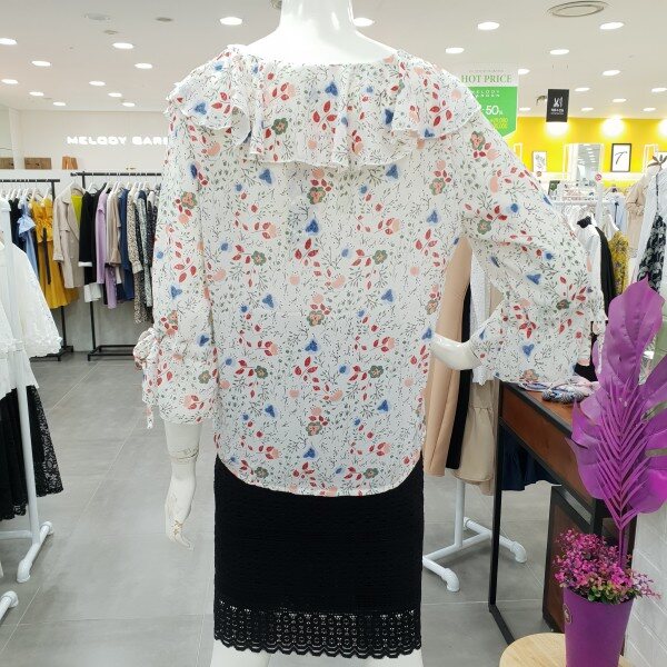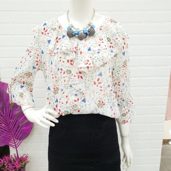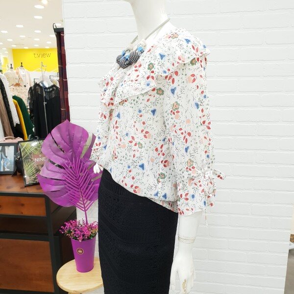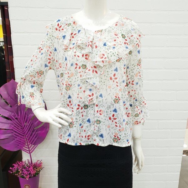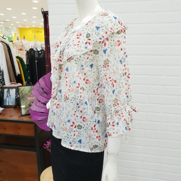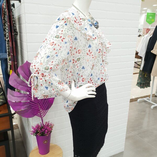 화사함이 느껴지는 블라우스예요.잔잔한 꽃 무늬가 여성스러움과 화사함을 주니 얼굴 톤 까지 밝아 보이는 블라우스죠.7부 소매에 얇은 쉬폰 소재로 시원하게 여름까지 입기 너무 좋아요.