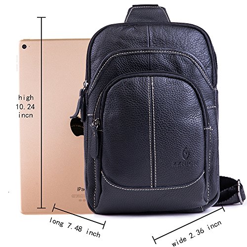 - MULTIPLE STORAGE PURPOSE SLING BAG:One large zippered compartments with small inner pouches. One front zipper pocket.Each zipper of the knapsack has a leather pull on it, so you can easily grip it. Larger zippered compartment can hold bottle (e.g. two small 7 or 8 ounces bottles) or Tablet such as Samsung Tab or iPad. Smaller zippered compartment can hold things such as phone, keys, MP3, first aid gear, pens/markers, Power Bank, business cards, or so on