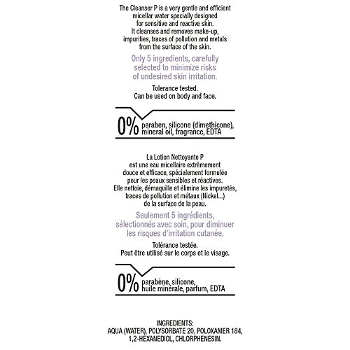 - CLEANSE YOUR SKIN, REMOVE MAKEUP, TRACES OF POLLUTION AND METALS - The Cleanser P is an extremely pure, soft and efficient micellar water which cleanses, removes makeup, traces of pollution and metals (Nickel...). It is recommended for sensitive, reactive or allergic skin.