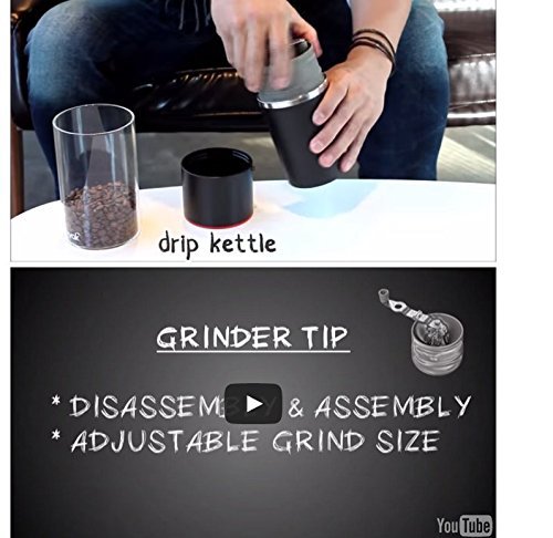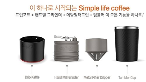 - Feature : World's first Portable All-in-one Coffee Maker = Drip Kettle + Hand mill Grinder + Metal Filter Dripper + Tumbler Cup into a single unit! / - Drip Kettle Upper Cup is used as a drip kettle Material: Polypropylene (PP) / Silicon (Tumble Lid) Capacity: 270ml / - Hand Mill Grinder Foldable handle, minimum space Ceramic Burr Grinder, Consistent & durable performance Capacity: up to 30g (Scale Indication of 10/15/20/25/30(Max)gram / - Metal Filter Dripper Metal mesh filter, eco-friendly, durable Easy to clean, easy to re-use / - Tumbler Cup Recommended extraction capacity: 250ml Maximum Capacity: 400ml