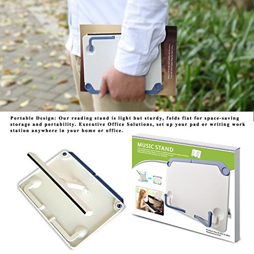 -. Feature : Multi-Function: This bookstand holds tablets, smartphone, eReaders at comfortable viewing or reading angle for hands free. Adjustable to several angles for maximum comfort with the maximum adjustable angle of 60° , ensuring eye health and work posture, effectively reduce eye fatigue and physical fatigue. Improve work efficiency. / Convenient to Use: The book holder can promote your correct posture, leading to less neck, back and eyes train when you reading over along periods of time. It is excellent for students, musician, cook in kitchen and free your hand / Portable Design: Our reading stand is light but sturdy, folds flat for space-saving storage and portability. Executive Office Solutions, set up your pad or writing work station anywhere in your home or office / Variable Use: Use as a cookbook or recipe holder, which allows the chef of the house to be hands-free for mixing, stirring, tasting, etc. Tablature reading, play the piano, guitar and some instruments, free your hands / Stylish Style: The reading book stand holder is stylish and plastic made, which is lightweight and portable, it can be stored in your backpack and used anywhere or anytime