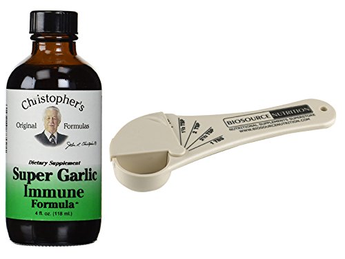 -. Binding : Health and Beauty -. Brand : Christopher's Original Formulas and Biosource Nutrition -. EAN : 0689771726083 -. Feature : Christopher's Original Formulas Super Garlic Immune Syrup 4 oz in Bundle with Biosource Nutrition Measuring Spoon / Immune support / Biosource Nutrition 5-in-1 measuring spoon / Measuring spoon is adjustable to measure 1 teaspoon to 1 tablespoon / Measuring spoon lid is removable for easy cleaning -. IsAdultProduct : 0 -. Label : Christopher's Original Formulas and Biosource Nutrition -. Manufacturer : Christopher's Original Formulas and Biosource Nutrition -. ProductGroup : Health and Beauty -. ProductTypeName : HEALTH_PERSONAL_CARE -. Publisher : Christopher's Original Formulas and Biosource Nutrition -. Studio : Christopher's Original Formulas and Biosource Nutrition -. Title : Christopher’s Original Formulas Super Garlic Immune Syrup 4 oz in Bundle with Biosource Nutrition Measuring Spoon -. UPC : 689771726083