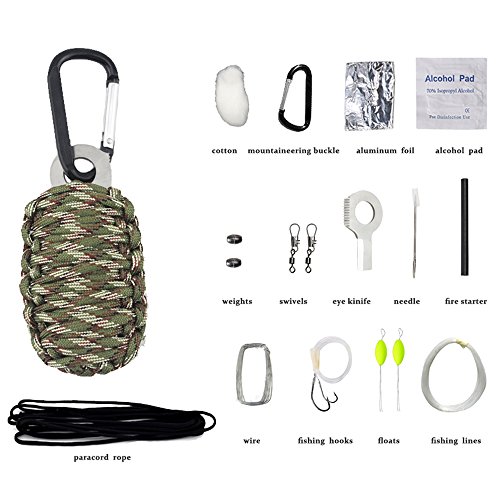 - 【14 Emergency Survival Tools】Small Size Big Capacity, It Might be Hard to Believe, But in This Smart Survival Kit We Have Included as Much as 14 Different Tools to Use in Outdoor Situations: 550 Paracord, Carabiner, Firebar, Alcohol Pad, Foil, Wire Saw, Swivels, Float, Cotton, Fishing Hooks and Line, Needle, Weights, and Eye Knife