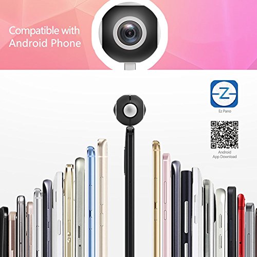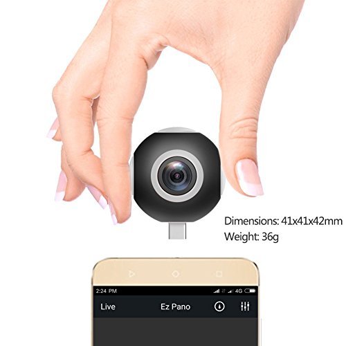 Providing 1920*960p 30fps HD videos. Using dual 220° fish-eye lenses to record video and stitches the data into a panoramic video, support for real-time preview. Pano Live I VR camera support real time 360 degree video/photo sharing on Facebook/ WeChat, Live streaming on YouTube. Ultra Portable And Unimaginable Small Size. Small like a table tennis, take it easily in your pocket or bag. Diameter 1.73” and 1.27oz. Say goodbye with complicated equipment and setting, just plug it into your Android Phone, use free EZ Pano App to take professional photos and videos. Compatible to Type-C & Micro USB Android Phones. Panoramic camera offers several viewing modes: ① Fisheye mode viewing ② Asteroid mode viewing ③ VR mode viewing (VR headset needed)