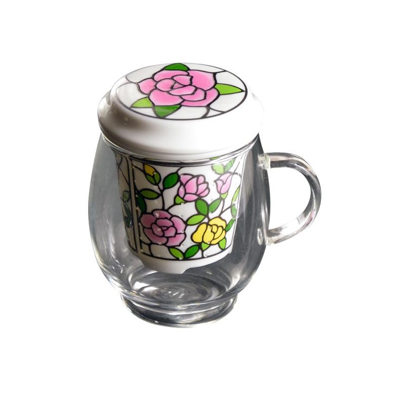 ガラスのマグカップに陶磁器の茶こしと蓋をセットしました。茶こしは底部が三つ脚になっており、マグカップに茶こしの脚を引っ掛け、熱いお茶の湯切りをすることができます。蓋は裏返すと茶こし受けとしてもご使用いただけます。ギフトにも最適♪ |