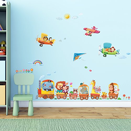 Decowall DAT-1406A1506B Animal Train and Biplanes Kids Wall Decals Wall Stickers Peel and Stick Removable Wall Stickers for Kids Nursery Bedroom Living Room