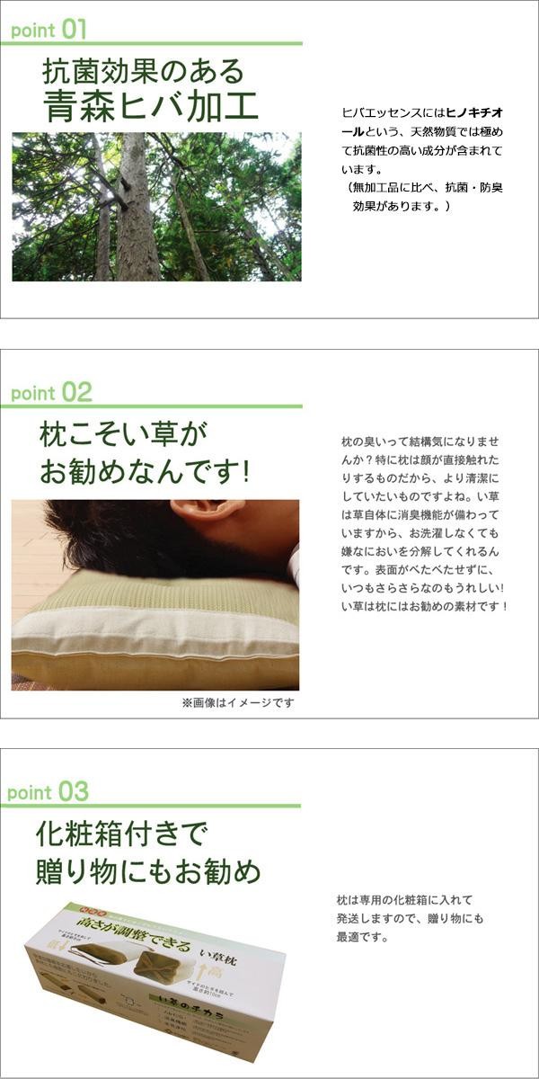 紐の結びを変えて頂く事で約5~10cmの間で高さが調節出来ます。国産のしなやかない草を使用していますので、柔らかくすべすべとした肌触りです。い草には抗菌・防臭効果のある青森ヒバ加工を施しています。中材には通気性の良いポリプロピレンパイプを使用しています。パイプのため通気性がよく、熱がこもりにくいのが特徴です。 |