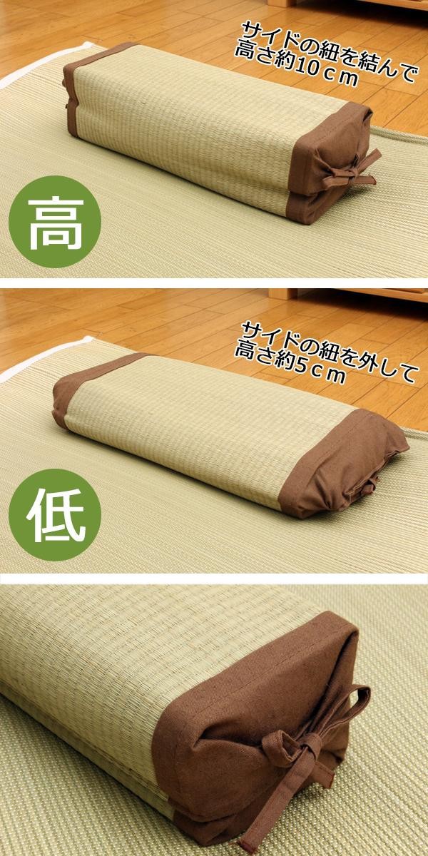 | 紐の結びを変えて頂く事で約5~10cmの間で高さが調節出来ます。国産のしなやかない草を使用していますので、柔らかくすべすべとした肌触りです。い草には抗菌・防臭効果のある青森ヒバ加工を施しています。中材には通気性の良いポリプロピレンパイプを使用しています。パイプのため通気性がよく、熱がこもりにくいのが特徴です。 |