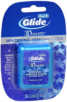 -. Binding : Misc. -. Brand : Crest -. EAN : 0037000133346 -. Feature : Delivers the cleaning and comfort you'd expect from Glide while helping to prevent surface stains between teeth.* Silky smooth texture slides up to 50% more easily in tight spaces vs. -. Label : Procter & Gamble Health Care -. Manufacturer : Procter & Gamble Health Care -. MPN : 531855 -. NumberOfItems : 4 -. PackageQuantity : 4 -. PartNumber : 531855 -. ProductGroup : Beauty -. ProductTypeName : BEAUTY -. Publisher : Procter & Gamble Health Care -. Studio : Procter & Gamble Health Care -. Title : Glide Oral-B 3D White Whitening Plus Scope Flavor Floss Radiant Mint - 38.2 yd., Pack of 4 -. UPC : 037000133346