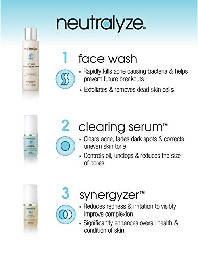 -. Feature : BREAKTHROUGH TREATMENT FOR MODERATE TO SEVERE ACNE - Clinically proven 95% effective. Neutralyze® delivers amazing results, you'll begin to see a noticeable improvement in as little as 2-3 days. Maximum strength acne treatment kit, includes Neutralyze® Face Wash (3.3 Ounce), Neutralyze® Clearing Serum (1 Ounce) + Neutralyze® Synergyzer (1 Ounce). 30 Day Supply. / REDUCES REDNESS & IRRITATION TO VISIBLY IMPROVE COMPLEXION - Neutralyze® is based on multi-patented Nitrogen Boost® Skincare Technology, the world's first acne solution to add the power of Nitric Oxide which promotes healing to help get rid of acne quickly. / EFFECTIVE ON VARIOUS ACNE RELATED ISSUES - Eliminates cystic acne, pimples, blemishes, whiteheads, blackheads, acne scars and post acne marks. Save time and money with this all-in-one acne system. / FADES DARK SPOTS & CORRECTS UNEVEN SKIN TONE - Our advanced, science-inspired acne treatment formulations contain prescription grade Salicylic Acid (BHA) and Mandelic Acid (AHA) to correct blotchiness. Minimizes the appearance of pores, fine lines and wrinkles, revealing youthful and attractive skin. / 100% MONEY BACK GUARANTEE - Neutralyze® Anti-Acne Solution offers a 100% Money Back Guarantee. If you aren't completely satisfied with your results, simply return the products to us within 60 days for a full, no-hassle refund!