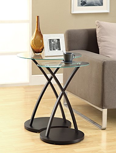 -. Feature : Two piece nesting table set / 5mm thick clear tempered glass oval shaped table tops / Bentwood legs support over a solid cappuccino base / Multi-purpose use as end, snack, or accent tables in a living room, family room, den, office space / Large table: 21. 5"l x 16"w x 20"h; small table: 16. 5"l x 11. 5"w x 18. 5"h
