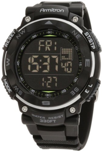 Black resin sport watch featuring round dial with backlight, chronograph function, and dual time display