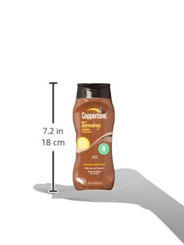 'Non-greasy, light formula. Sunscreen lotion. UVA/UVB protection. Waterproof. Moisturizing with Aloe and Vitamin E. Fast-absorbing. Coppertone SPF 8 Sunscreen Lotion provides Coppertone certified SPF protection from the sun's damaging UVA/UVB rays. This lightweight fast-absorbing lotion leaves no greasy residue on your skin. This non-greasy formula is also hypoallergenic and non-comedogenic, so it won't clog pores or cause breakouts. Coppertone SPF 8 Sunscreen with Aloe and Vitamin E moisturizes your skin to help prevent peeling and dryness while helping to maintain healthy-looking skin. Coppertone SPF 8 Sunscreen provides waterproof protection and SPF protection you can trust. PABA-free, Dermatologist tested. Suncare products with an SPF below 15 may not provide adequate protection against sunburn and skin damage for some skin types. Many skin care experts recommend that you regularly use at least an SPF 15 to help reduce the risk of premature aging, wrinkling and skin cancer, especially if you burn easily or spend long periods of time in the sun.Feature