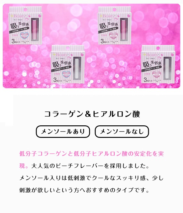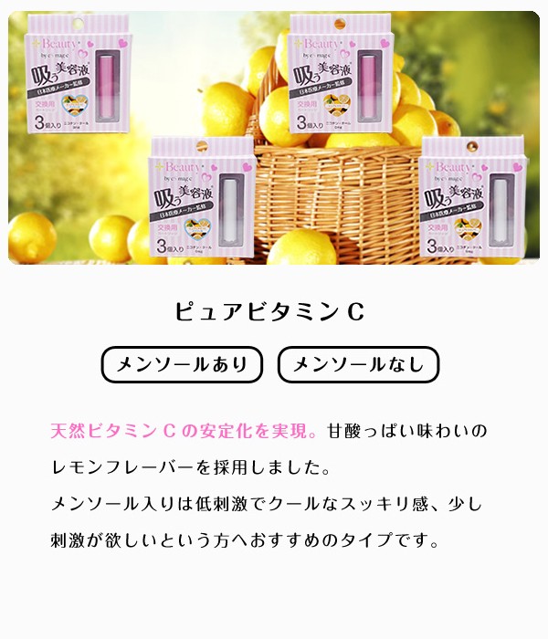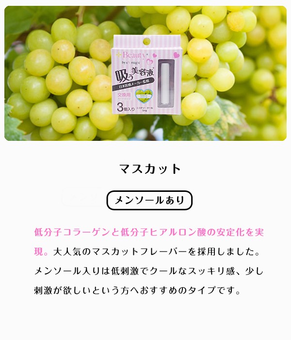| 種類 | ピュアビタミンC1000 ピュアビタミンC1000メンソール コラーゲン&ヒアルロン酸 コラーゲン&ヒアルロン酸メンソール ピンクグレープフルーツ ピンクグレープフルーツメンソール ストロベリーメンソール マスカットメンソール |