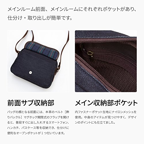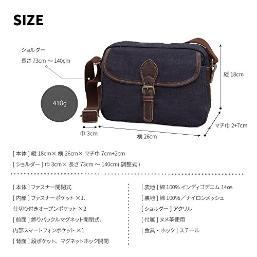 -. Feature : 【軽くて丈夫、岡山産デニム生地使用】Amazon配送センターより迅速かつ安心・安全にお届け致します! / ★日本製 生産地:京都[安心安全こだわり岡山産14㌉インディゴデニム使用]コンパクトサイズで充実機能が魅力 / [本体]縦18cm×横26cm×マチ巾7cm+2cm [ショルダー]巾30mm×長さ73cm~140cm(調整式)[重さ]410g / [表地]綿100%インディゴデニム14os[裏地]綿100%/ナイロンメッシュ[ショルダー]アクリル[付属]ヌメ革使用[金具・ホック]スチール / "[本体]ファスナー開閉、 [内部]ファスナーポケット×1、仕切り付きオープンポケット×2 [前面]前ポケット飾りバックルマグネット開閉式、内部スマートフォンポケット×1 [背面]段ポケット、マグネットホック開閉"