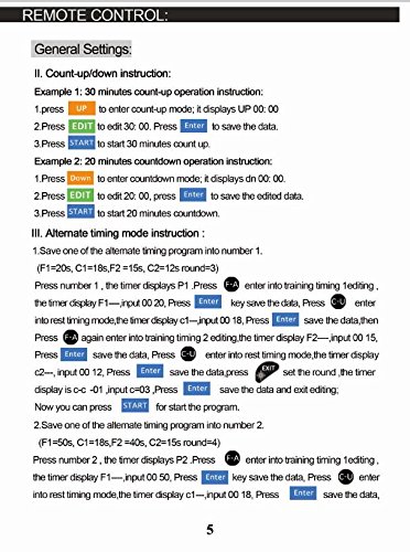 40 seconds for exercise then 20 seconds for rest and repeat two times. Setting: (F1 00:40 C1 00:20; C-C - 02) 1st step: press "digit 1" button to interval timing mode, timer show "P1". 2nd step: press " F-A" button and input 00 40, press "enter" to save 3rd step: press "C-U" button, and input 00 20, press "enter" to save 4th step: press "EXIT" key to set repeat times. Input 02 and then press "enter" to save all the setting. Final step: