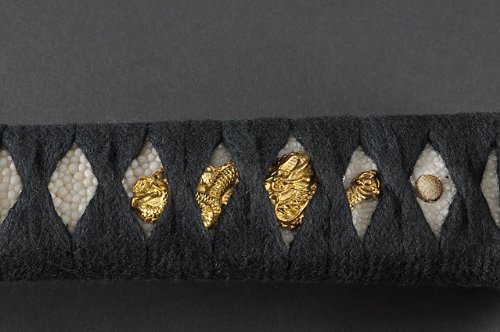 • Wooden handle wrapped w/ray skin & brown cotton cord w/ Dragon menuki