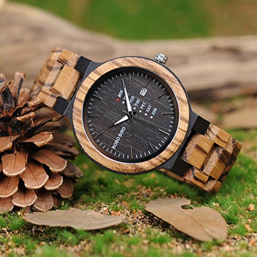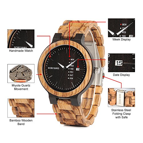 2. Handmade natural zebra wood material make the watch smooth and comfortable to wear; Brown week and date display Dial; Folding clasp with safety; Adjustable wrist band comes with free fix tool