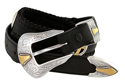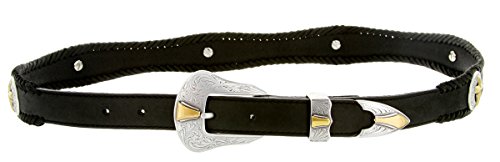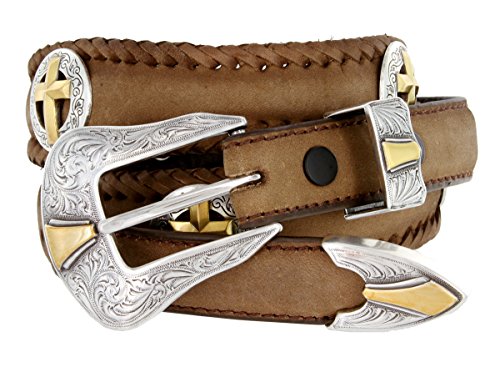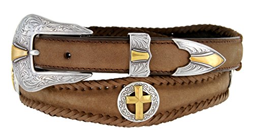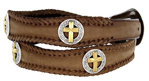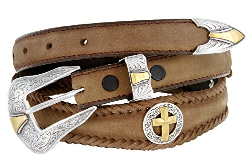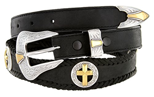 Binding : Apparel Product Description An oil-tanned harness leather belt with hand-laced edging, fitted with a sliver plated floral engraved rope-edged three-piece buckle set, ornamented with silver Christian cross conchos cast from hand-engraved masters. 1" wide with 1 and 3/8" scallops. Our belts are measured from where the leather ends at the buckle end to the middle hole at the tip end. 0