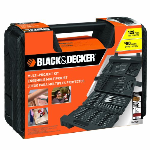 The Black & Decker 71-91291 129-piece Multi Project Kit has all you need for most projects around the house. The kit includes an assortment of general-purpose, brad-point, and masonry drill bits (36 total), 4 spade bits, 12 hex keys, 9 nutdrivers, a drill bit gauge, a magnetic bit tip holder, and 66 assorted 1- and 2-inch screwdriving bits. Hang pictures and other home decor Assemble furniture Mount exterior house number or ornaments on stone or brick Install curtains / blinds Indoor / Outdoor drilling in wood, masonry, metal and plastic Fasten Or Hang Window Boxes Drill large holes or run wiring Install new cabinet hardware Catalog Number Description Qty General Purpose Drill Bits (wood, metal and plastic) 19 Brad Point Drill Bits (wood only) 13 Masonry Drill Bits (rotary - use in non-hammer mode) 4 Spade Bits 4 Hex Keys 12 Nutdrivers 9 Drill Bit Gauge 1 Magnetic Bit Tip Holder 1 1" Screwdriving Bits: Phillips, Slotted, Hex, Square and Star 48 2" Screwdriving Bits: Phillips, Slotted and Star 18Feature