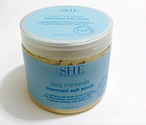 -. Feature : rich mermaid salt scrub exfoliates & nourishes the skin / formulated with a creamy base of shea butter ,olive oil,finely ground rice bran ,salt & essential oil / skin is left soft , smooth and radiant / not to be used on the face