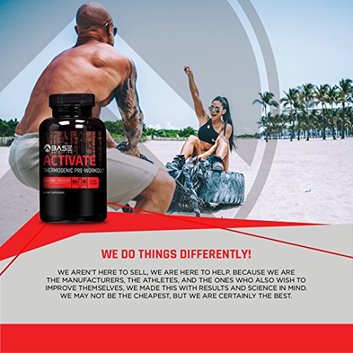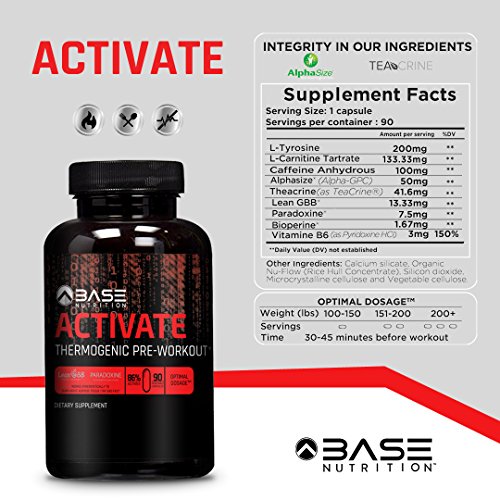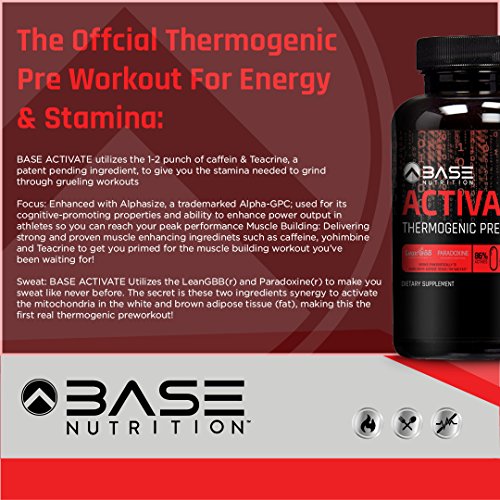 -. Binding : Health and Beauty -. Brand : BASE Nutrition LLC -. Feature : INCREASE STRENGTH, ENERGY AND STAMINA: Top-rated pre workout supplement with caffeine, BASE ACTIVATE gives you the stamina and energy you need to grind through grueling workouts by using a non-proP.R.Ietary blend of ingredients that provides a great strength and workout booster / STAY FOCUSED: This thermogenic pre workout for women and men uses a patented Alapha-GPC formula to supercharge both mental and physical performance in the gym so you can build muscle and stay focused during your workout / LOSS WEIGHT: The supplement pills include a clinically-dosed pre workout weight loss formula of creatine-free ingredients like Alpha-GPC, yohimbine, theacrine and caffeine / MADE IN THE USA and a certified manufacturer for the U.S. Military. All BASE Nutrition pre workout supplement pills are manufactured in our FDA & USDA Organic Certified facility. Rest assured that our formulas are clinically tested, certified and safe / 100% MONEY BACK GUARANTEE: If we did not meet your expectations, ask for a refund. We won't say no - that's how confident we are that you'll absolutely love our pre-workout supplement -. IsAdultProduct : 0 -. Label : BASE Nutrition LLC -. LegalDisclaimer : *These statements have not been evaluated by the Food and Drug Administration.These products are not intended to diagnose, treat, cure or prevent any disease. -. Manufacturer : BASE Nutrition LLC -. MPN : BASEACTIVATE -. PackageQuantity : 1 -. PartNumber : BASEACTIVATE -. ProductGroup : Health and Beauty -. ProductTypeName : HEALTH_PERSONAL_CARE -. Publisher : BASE Nutrition LLC -. Studio : BASE Nutrition LLC -. Title : BASE ACTIVATE Pre Workout Supplement Pills for Men & Women - Thermogenic Preworkout Pills that Increase Strength, Energy & Weight Loss - 75 Capsules
