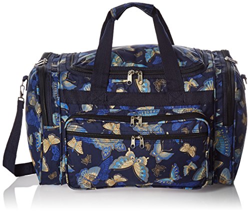 -. Binding : Apparel -. Brand : World Traveler -. Feature : Polyester construction, top zipper opening, two front zipper pockets and 2 side pockets / Detachable and adjustable shoulder strap / Has 2 carry handle and rear strap that slide over luggage handle / Dimensions: 19 in l x 10 in w x 12 in h - 2 lb / 19x10x12 -. Label : World Traveler -. Manufacturer : World Traveler -. PackageQuantity : 1 -. ProductGroup : Apparel -. ProductTypeName : BAG -. Publisher : World Traveler -. Studio : World Traveler -. Title : World Traveler Value Series Blue Moon 19-Inch, Gold Butterfly Duffel Bag